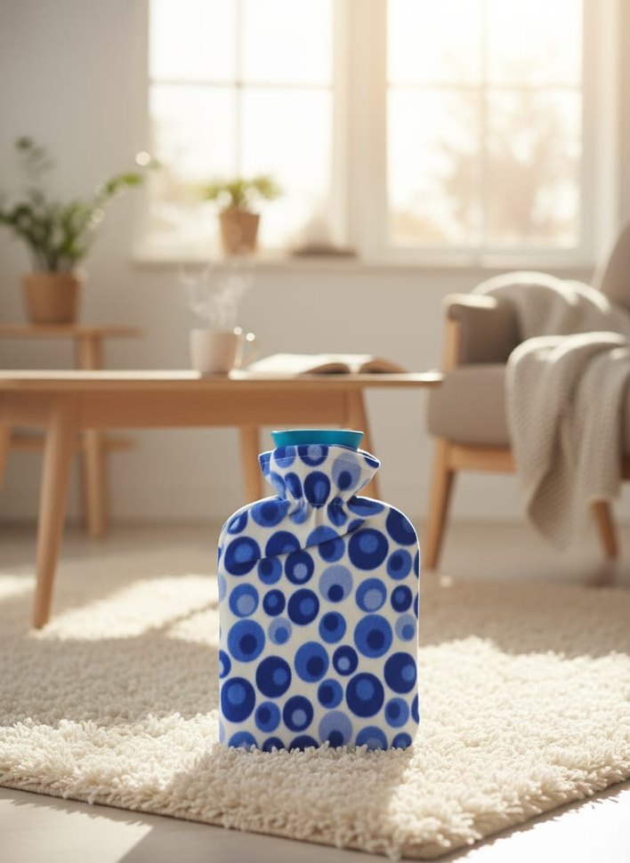 Mavi desenli renkli sıcak su torbası, güvenli kapaklı ve rahat ısıtma sağlar.