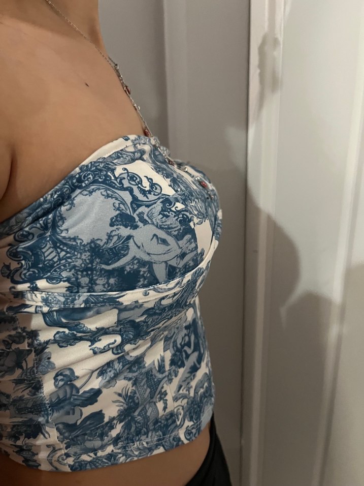 Mavi ve gri desenli,, straplez ve fitted kesim bustiyer, cesur sokak stili için uygun.