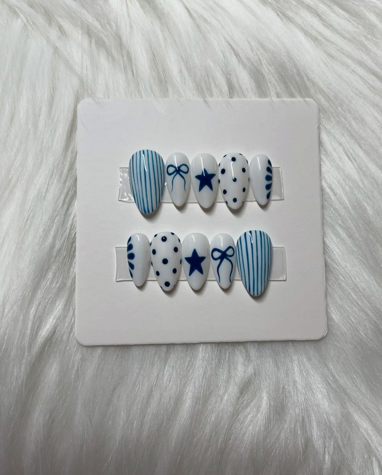 Yanında törpü+yapıştırıcı+tırnak Eti itici hediye Beyaz zemin üzerinde çizgili, yıldızlı, puantiyeli ve fiyonk desenli renkli mavi tırnak süslemeleri seti.