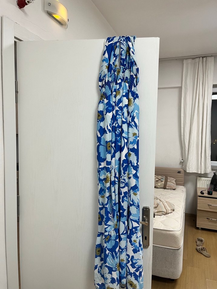 Mavi desenli uzun elbise, bol kesim ve drapeli tasarımıyla, askılı halter yaka ve hafif sentetik kumaştan üretilmiştir. Açık hava etkinlikleri için uygundur.