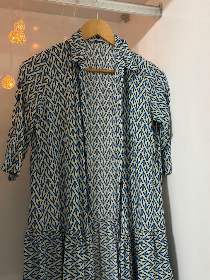 Mavi desenli, pileli detaylara sahip, bol kesim ceketi, yumuşak kumaştan günlük kullanım için uygun.