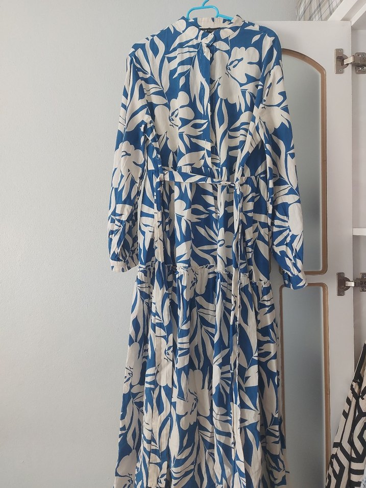 Mavi renkte, uzun boy, bol kesim, pilili detaylara sahip bohem elbise. V yaka ve uzun kolludur, günlük kullanıma uygundur.