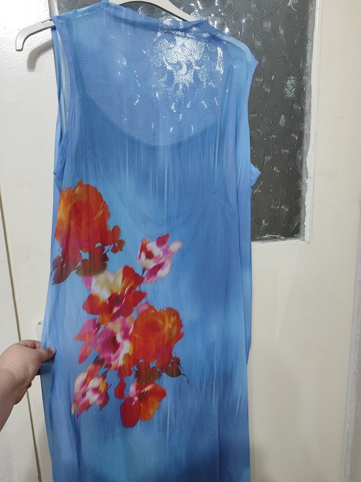 Kolsuz, straplez mavi uzun elbise, drapeli ve canlı çiçek desenli bağlamalı baskıya sahip, bohem tarz için uygun. Alıcının bilgisine.. Ön çiçek deseni olan bölümde ufak bir defosu mevcut 6xl fakat vicudu saran bir elbise