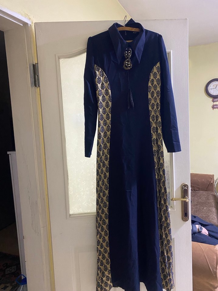 Mavi renkte, ipeksi kumaştan yapılmış, drapeli ve desenli yan panelli uzun kadın elbisesi. Notlu yaka ve uzun kolludur, ofis için uygundur. ✨
