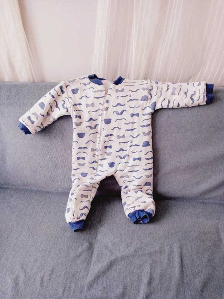 Mavi renkli, uzun kollu ve yuvarlak yakalı bebek tulumu, yumuşak ve sıcak kumaştan örülmüş, renkli bıyık ve şapka desenlerine sahiptir.
