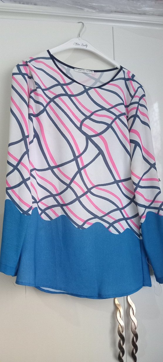 Kadınlar için tekne yakalı, uzun kollu, bol ve uzun kesim mavi desenli bluz. Yumuşak sentetik kumaştan, pastel batik desenli ve pile detaylıdır.
