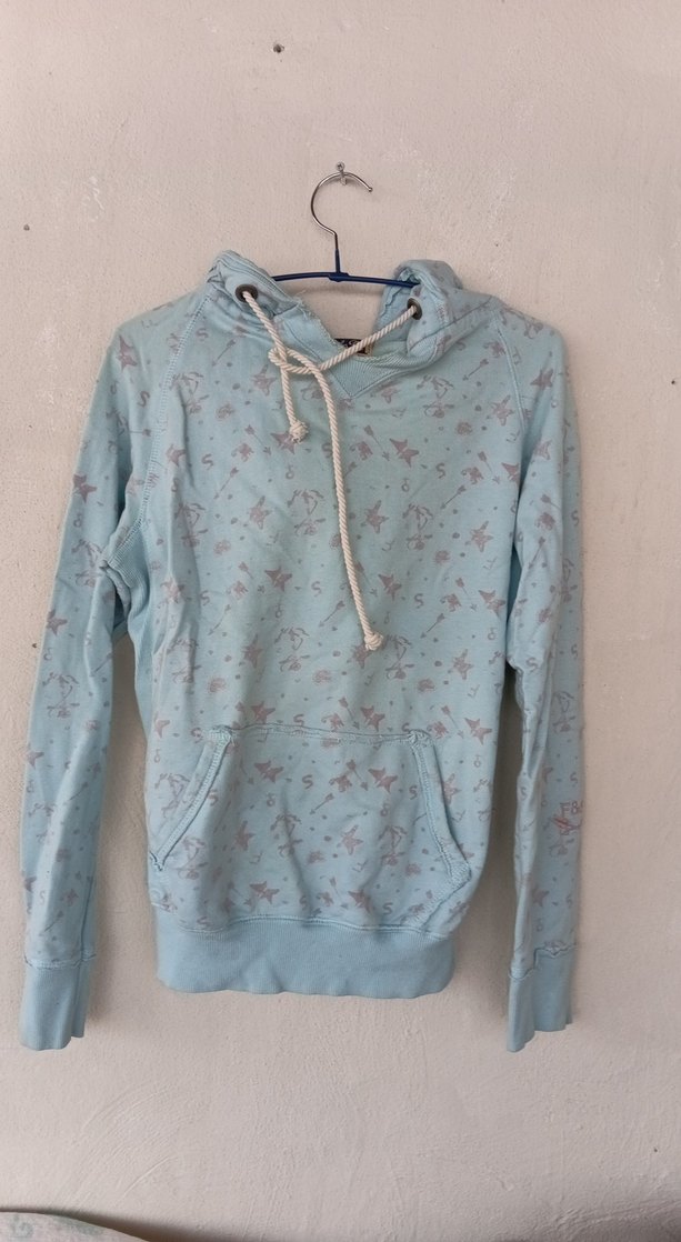 Bol kesim, uzun kollu, yüksek yakalı kadın sweatshirtü. Pastel mavi renk ve desenli, yumuşak sentetik örgü kumaştan, günlük kullanım için uygundur.