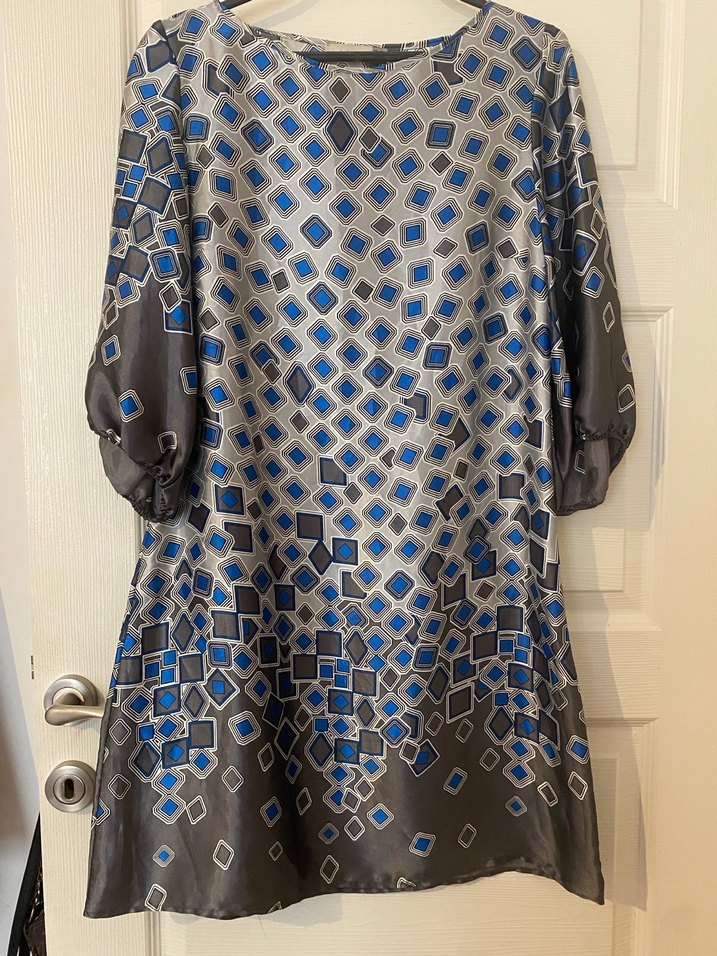 Gevşek kesimli, uzun kollu ve kayık yaka mavi-gri geometrik desenli midi elbise, yumuşak sentetik kumaştan üretilmiştir.