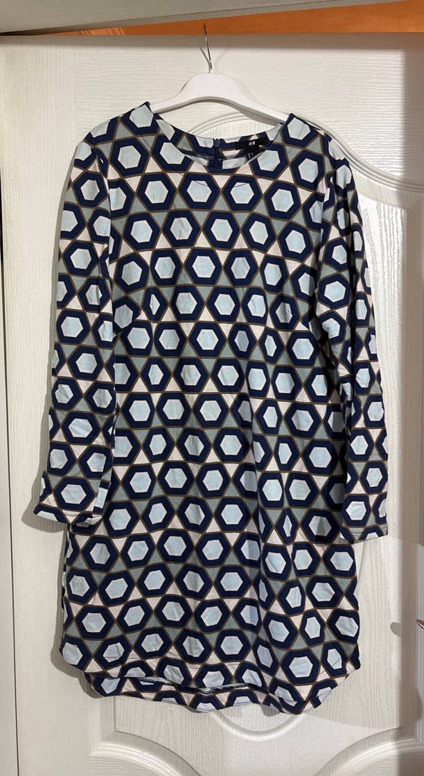 Bu bol kesim midi tunik, uzun kollu ve yuvarlak yakalıdır. Koyu geometrik desenli, yumuşak sentetik kumaştan yapılmıştır. Dökümlü stiliyle çağdaş ve bohem görünüme uygundur. 90 cm