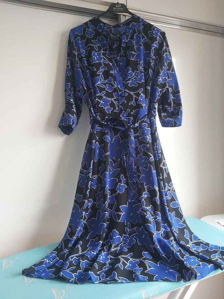 Mavi desenli uzun elbise, salaş kesim ve dökümlü yumuşak kumaşa sahip. V yaka ve üç çeyrek kolludur. Vintage bohem tarzını yansıtır. Günlük kullanım için uygundur.