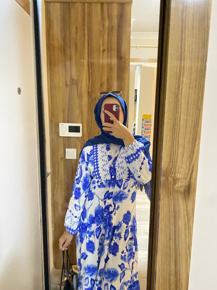 Uzun, bol kesim bohem elbise; yüksek yakalı, uzun kollu, açık mavi bağlamalı desenli ve püsküllü, yumuşak seramik dokulu kumaştan.