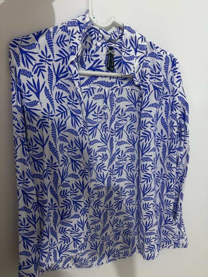 Uzun kollu, bol kesim ve hafif sentetik kumaştan yapılmış mavi desenli kadın gömleği. V yaka ve düğmeli ön kısmıyla bohem tarzda, günlük kullanıma uygun.