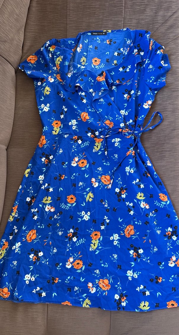 Mavi renkte, kısa kollu, V yaka ve fırfırlı detaylı midi boy bohem elbisedir. Belde bağlama ipi ve canlı desenlere sahiptir.
