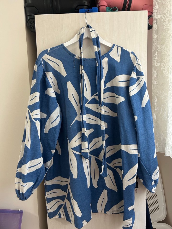 Mavi desenli, V yakalı, uzun kollu ve bol kesim hamile bluzu. Yumuşak keten kumaştan, salaş ve günlük kullanıma uygun.