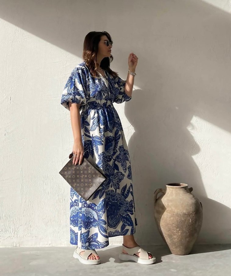 Mavi renkli, desenli ve parlak kumaştan üretilmiş, V yakalı ve askılı uzun kadın elbisesi. Salaş kesimi, rahat ve şık bir görünüm sağlar.