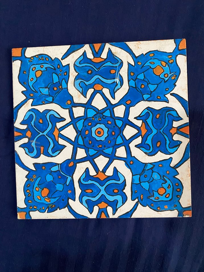 Bu yapboz parçası, koyu mavi renkli geometrik desenler ve turuncu detaylar içerir.