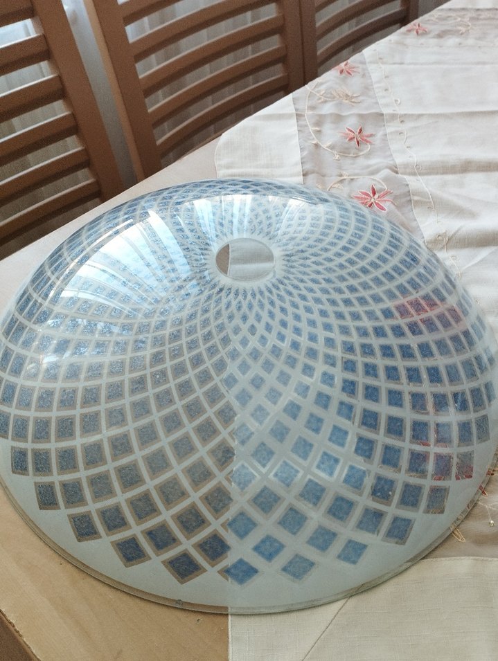 Mavi desenli yuvarlak tavan fanı kapağı, ışığı eşit şekilde dağıtır. Ortasında montaj için delik bulunur. desenin de hiç bir sıkıntı yok silinip değil