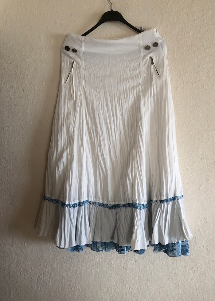 Ürün cepsizdir Yandan fermuarlı Düğme ve cep görünüm detaylı Temiz leke solma herhangi bir problemi yok Çok kaliteli bir ürün M /38 Uzunluk 99 cm (bilek boy )
