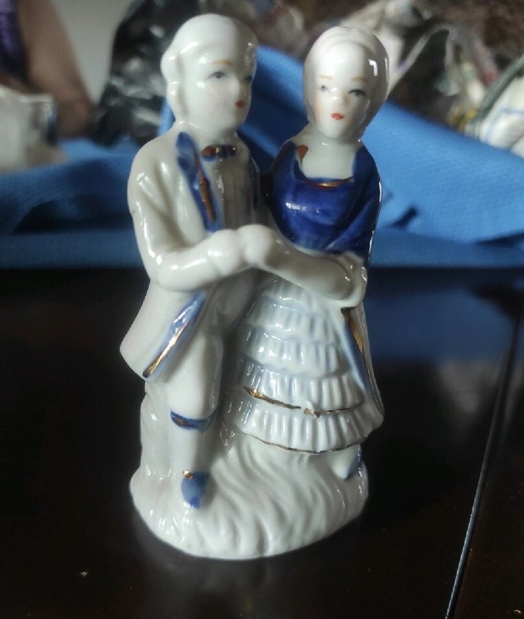 Üzerinde koyu mavi detaylar bulunan çift figürin. Zarif pozda ve ince detaylarla boyanmıştır.