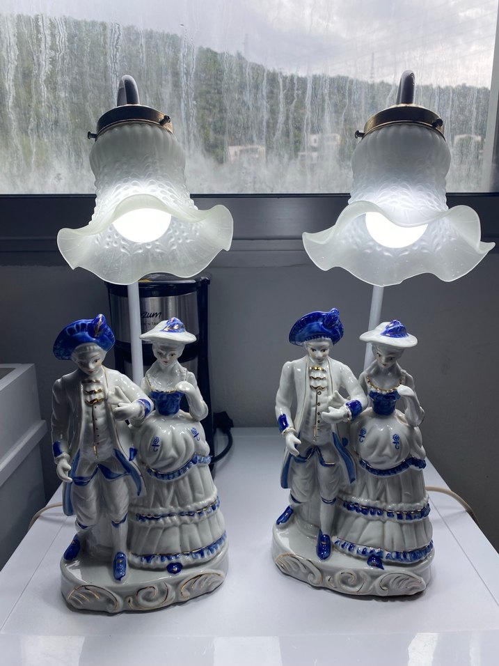 Mavi detaylara sahip geleneksel kıyafetli çift figürlü, üstü beyaz şeffaf abajurla tamamlanmış lambalar.