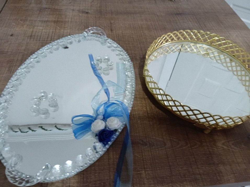 Mavi kurdele ve çiçek detaylı, parlak süslemeli dekoratif ayna. Her mekana şık bir dokunuş katar.