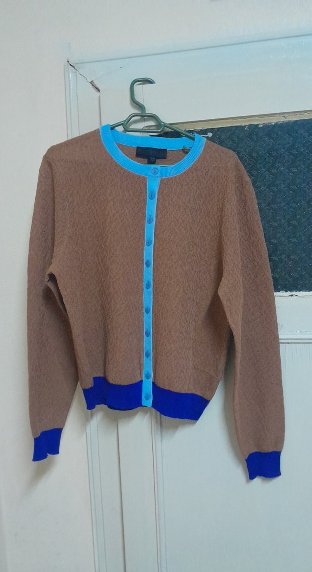 Mavi detaylı kahverengi, uzun kollu, triko hırka. Yuvarlak yaka, düğmeli ve midi boy, rahat kesimle günlük kullanıma uygun.