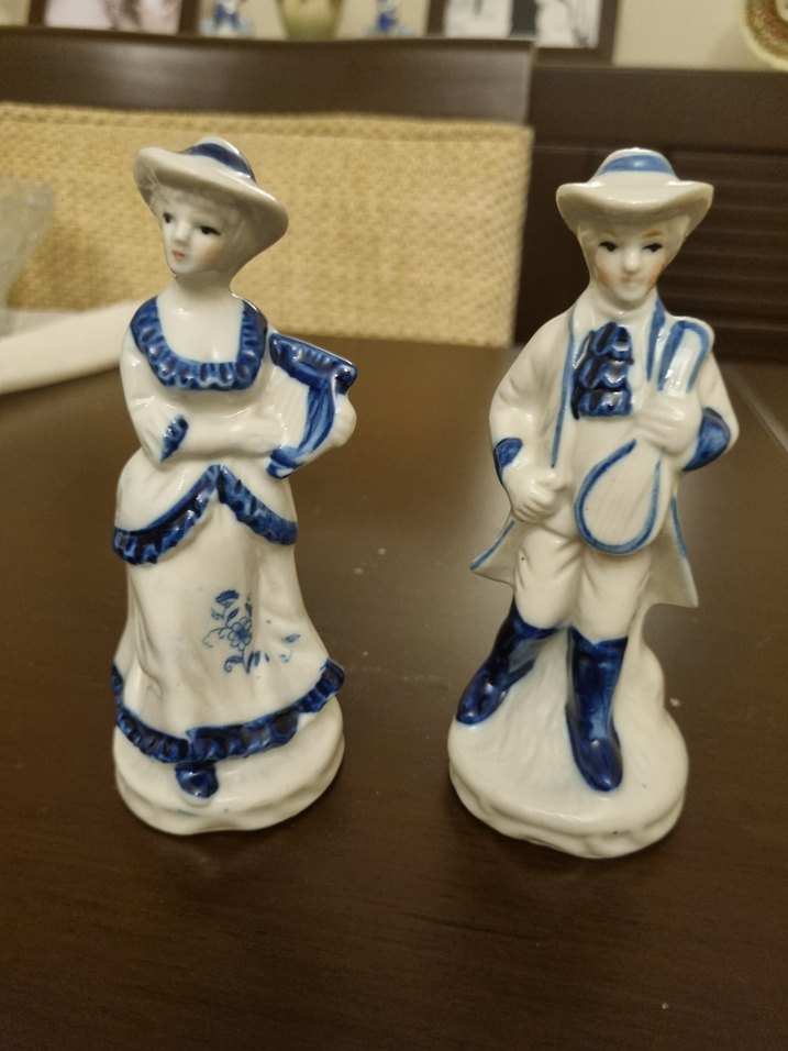 Mavi detaylı, kadın ve erkek figürlü klasik seramik biblolar seti. Kadın elinde yelpaze, erkek müzik aleti taşıyor.