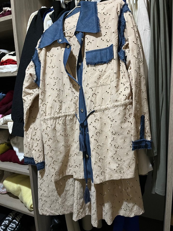 Gevşek kesim, uzun kollu, mavi detaylı nakışlı tekstil kumaştan yapılmış kadın ceketi. Önü düğmeli, kısa boyda, günlük sokak stili için ideal.