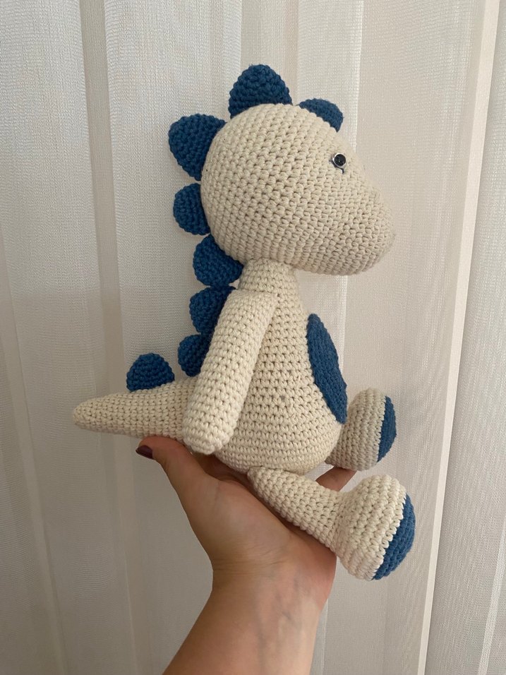 Mavi detaylı, el örgüsü dinozor peluş oyuncak, yumuşak dokusu ile sevgi dolu bir arkadaş.