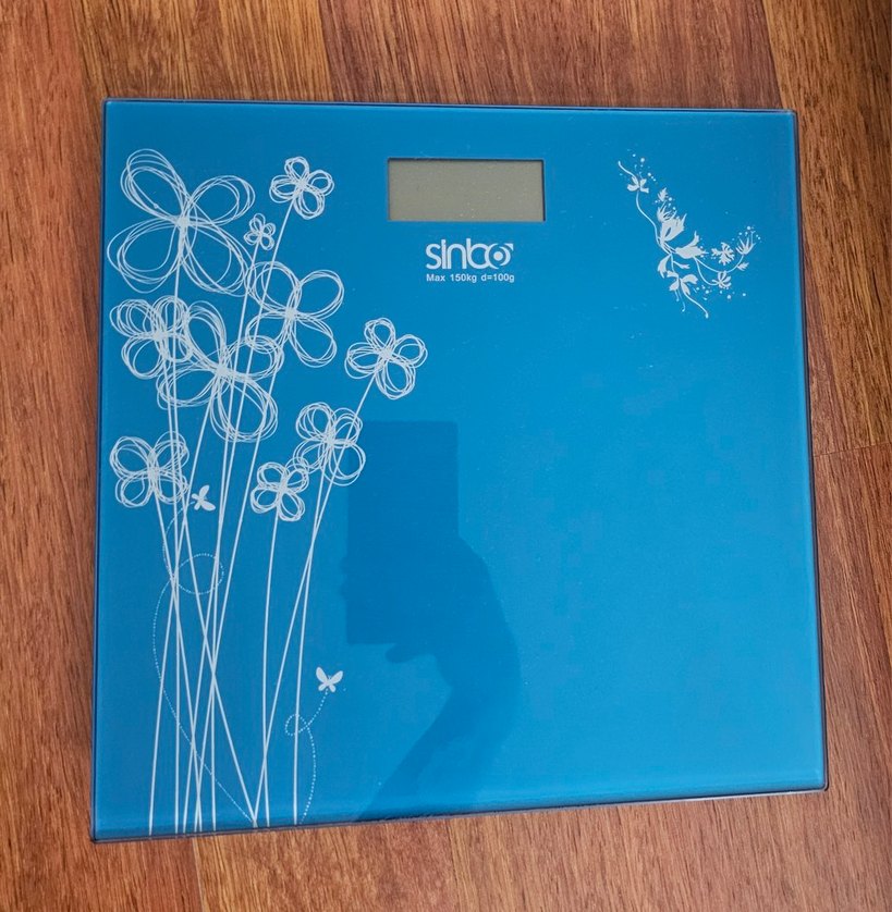 Sinbo marka, 150kg kapasiteli, 100g hassasiyetli mavi dijital baskül, çiçek desenli ve dijital ekranlı. yuvarlak 2025 pil ile çalışır.