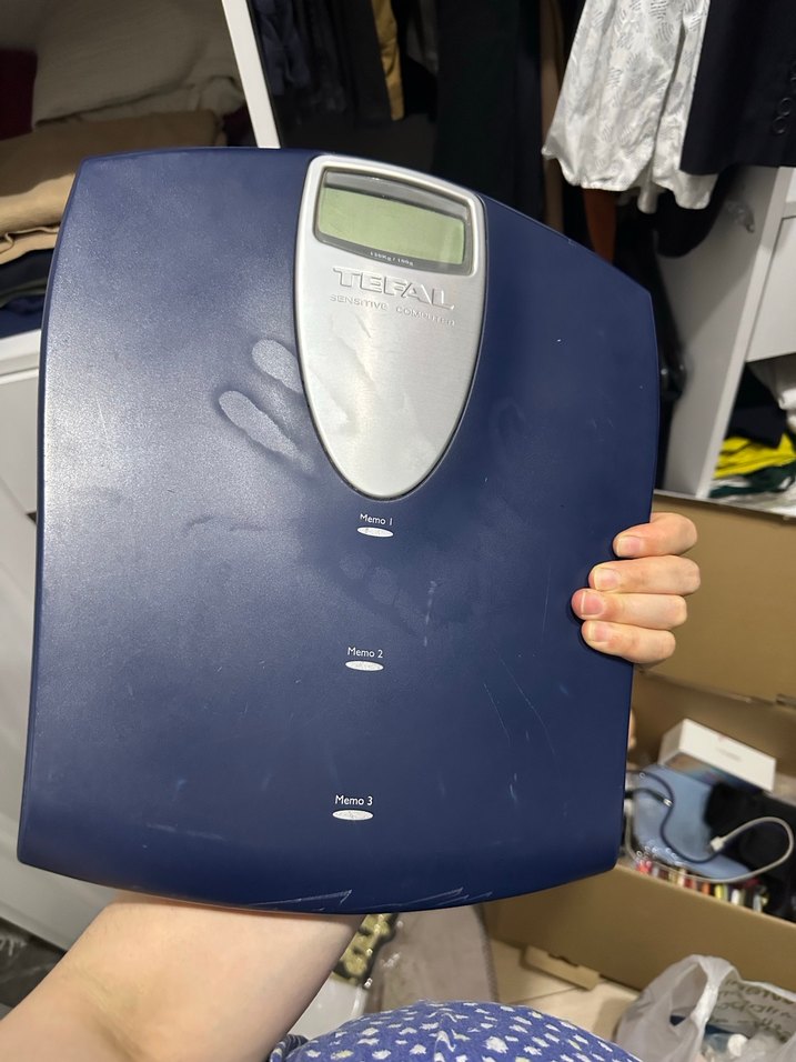 Tefal marka dijital tartı, koyu mavi yüzey ve üç hafıza ayarı ile ağırlık takibine olanak sağlar. Sağlam ve kullanışlı tasarıma sahiptir. ⚖️ pil takıl yerin yayı değişilmesi gerekiyor o nedenle uyguna veriyorum