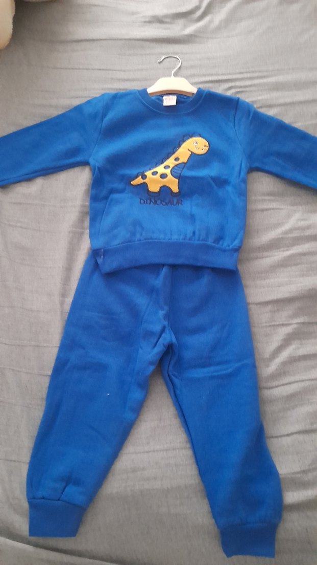 Mavi uzun kollu üst ve pantolondan oluşan, yumuşak ve sıcak kumaştan erkek bebek eşofman takımı. Üstte renkli dinozor desenli örgü detay bulunur.