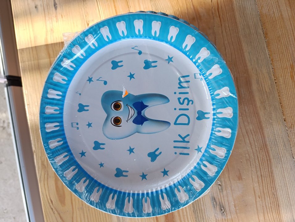 Mavi renkte, gülen diş figürü ve "İlk Dişim" yazılı parti tabakları. Diş temalı kutlamalar için uygundur.