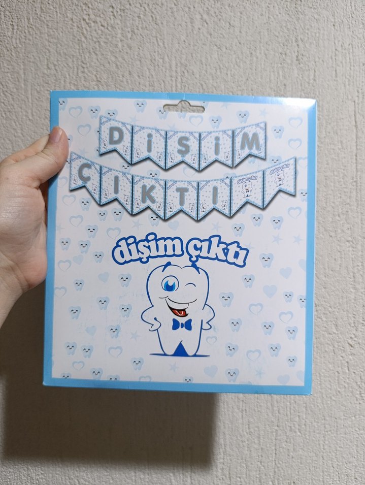 Mavi pastel renkte, üzerinde 'dişim çıktı' yazısı ve gülen diş figürü bulunan parti süsü 1-2 saat kullanıldı