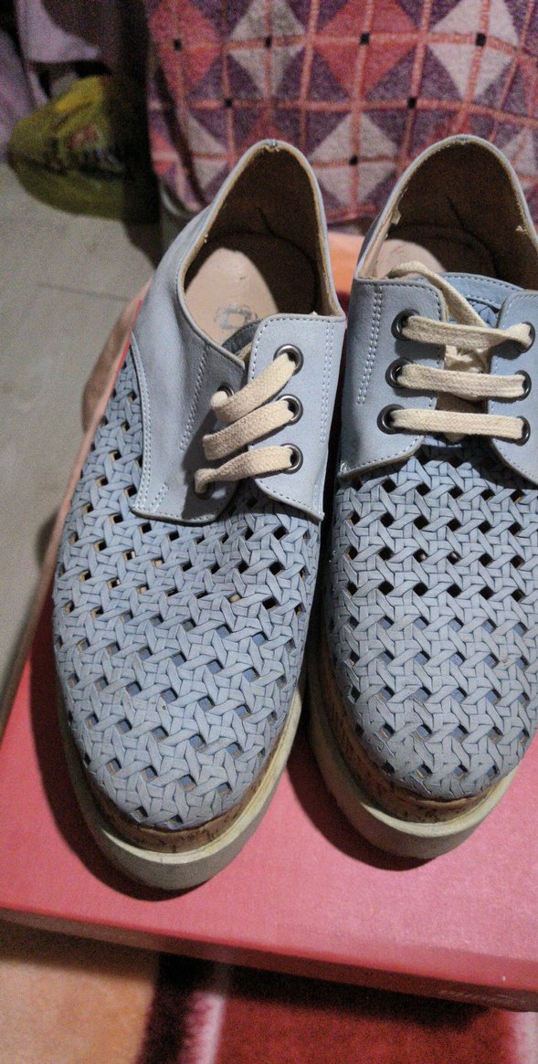 Mavi renkte, bağcıklı ve dolgu topuklu kadın spor ayakkabısı. Örgü görünümlü kauçuk üst yüzey, günlük rahat kullanım için uygundur.