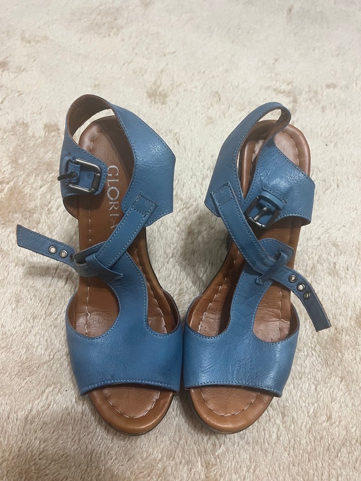 Mavi dolgu topuklu kadın sandalet, tokalı kayışlı ve kauçuk malzemeden yapılmıştır. Minimalist, parlak tasarım, günlük kullanım için uygundur.