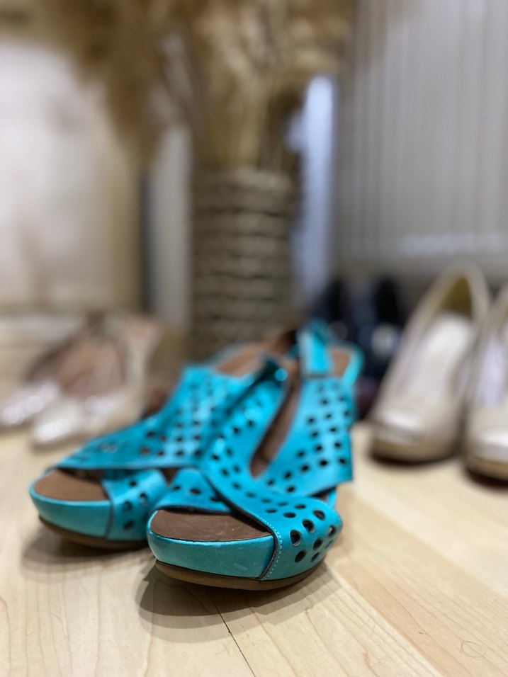 Mavi renkli, dolgu topuklu kadın sandalet. Kauçuk malzemeden, tokalı ve minimal desensiz tasarıma sahip, günlük kullanıma uygun.