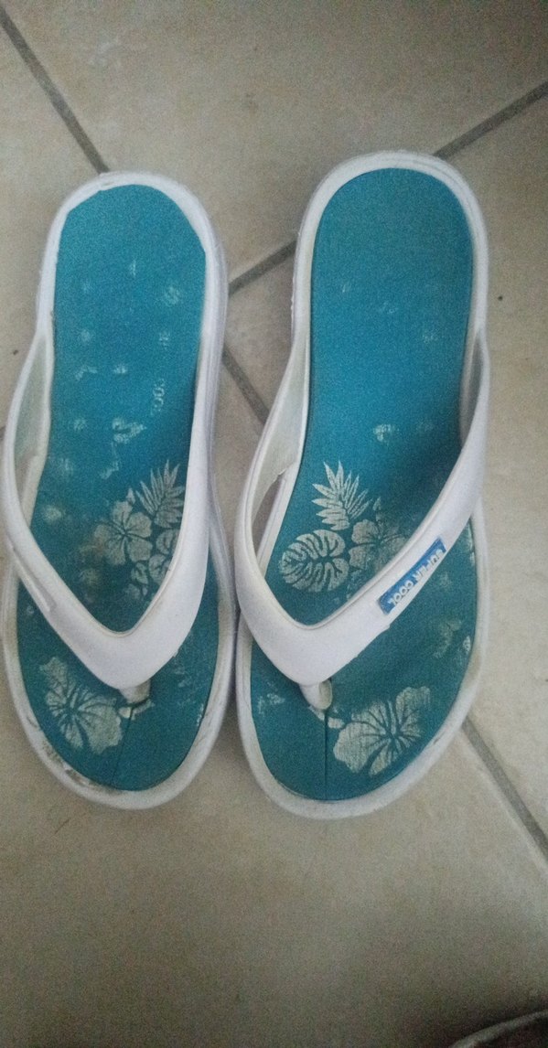 Mavi baskılı tabanı ve beyaz dolgu topuklu kauçuk plaj terliği. Cırt cırtlı bant ile rahat ve güvenli kullanım sağlar, bohem ve minimalist tarzda.
