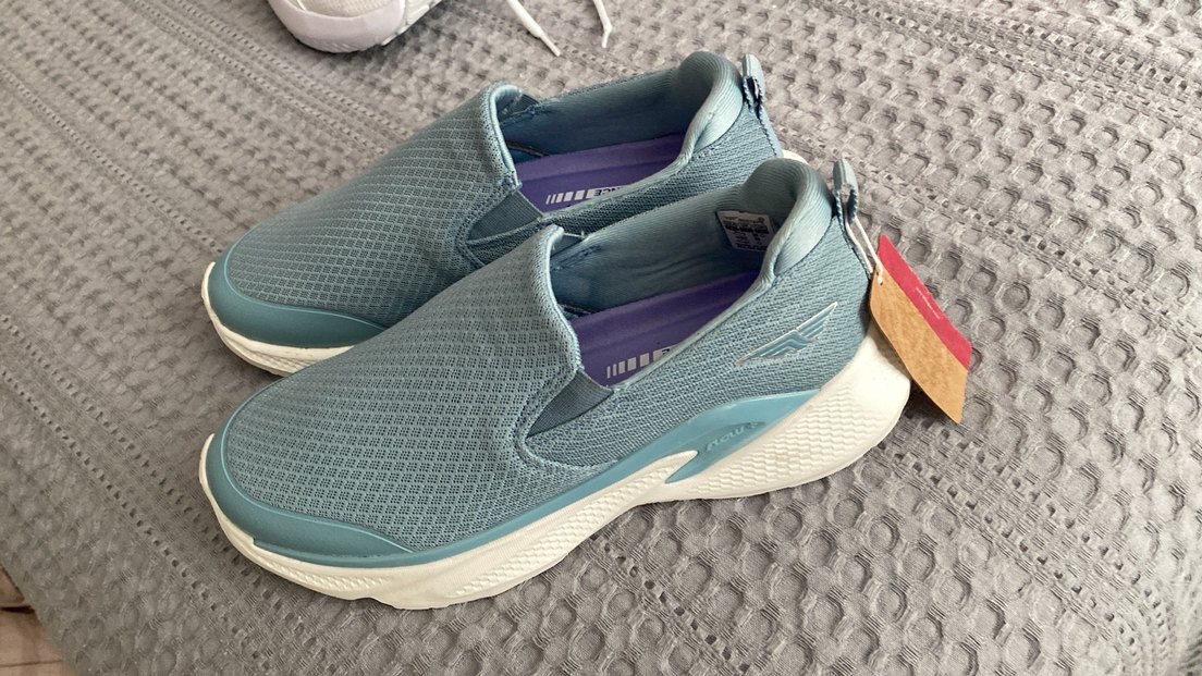 Mavi renkli, dolgu topuklu ve bağcıklı tasarıma sahip, kauçuk tabanlı ve nefes alabilir üst kısmı olan spor ayakkabılar.