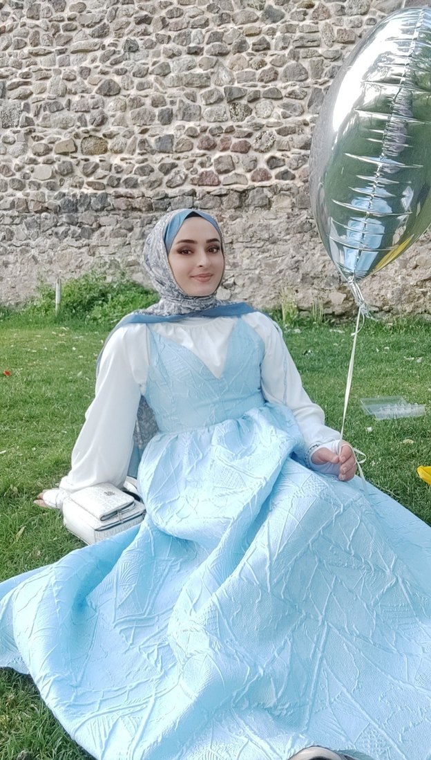 Pastel mavi renkte, yüksek yakalı ve etnik desenli, drape detaylı uzun tesettür abiye. Düzgün kesim ve mütevazı tarzda, düğünler için uygun. Kolsuz ve uzun boy.