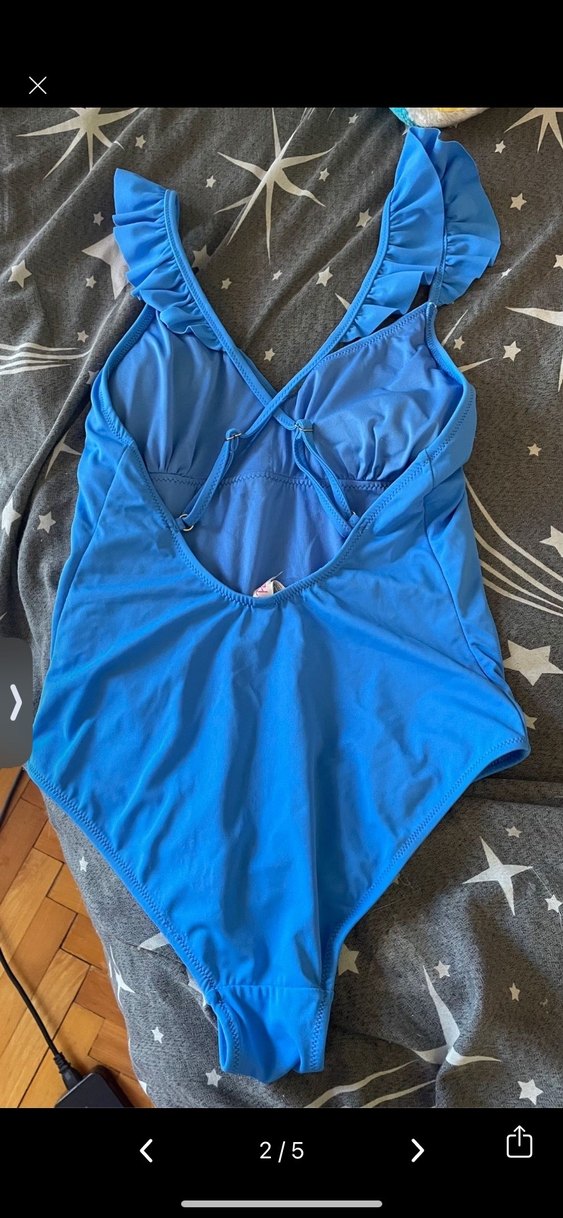 Mavi renkli, drapeli detaylara ve askılı kollara sahip, vücuda oturan kadın mayo. Midi boyda, plaj ve sokak stili için uygun, cesur athleisure tarzında. S&M uyumlu