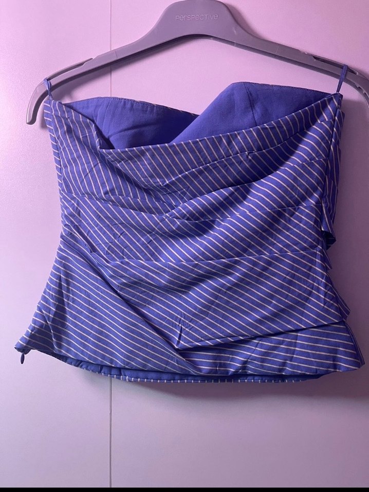 Drapeli ve askısız tasarıma sahip, ince çizgili, koyu mavi renkli sentetik kumaştan yapılmış, vücuda oturan midi büstiyer.