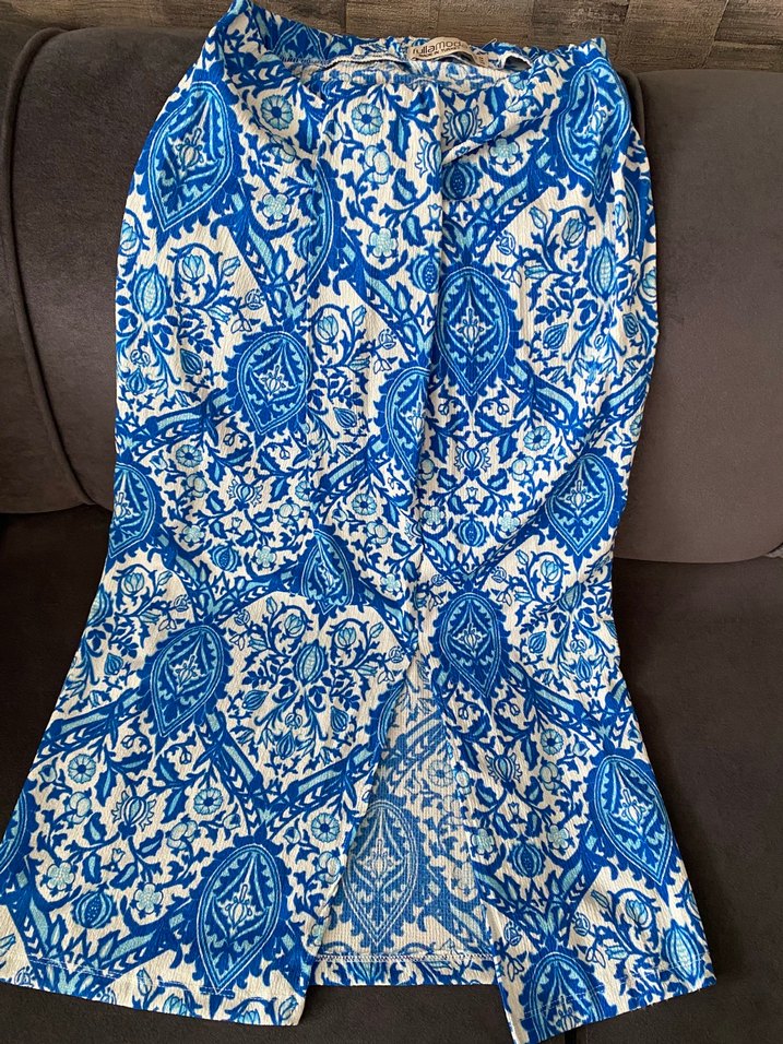 Drapeli tasarıma sahip, koyu mavi bağlama desenli, sentetik kumaştan uzun ve vücuda oturan hamile eteği. Günlük kullanıma uygun.