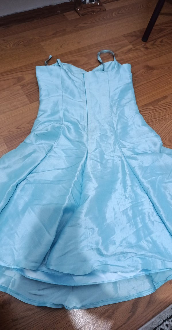 Drapeli kesimi ve straplez yakasıyla mavi, parlak elbise. Bohem vintage tarzında, parti için uygun şık bir modeldir.