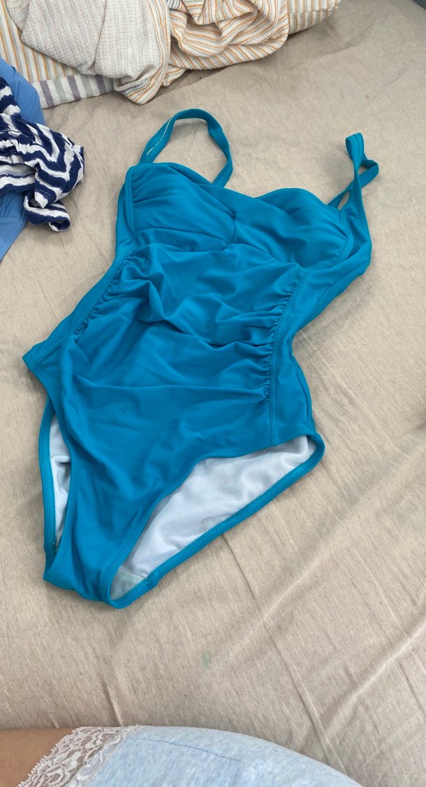 Mavi renkli, drapeli detaylı ve ince askılı, vücuda oturan kadın mayosu. Plaj için uygun, çağdaş ve renkli athleisure tarzında, normal midi boyda.