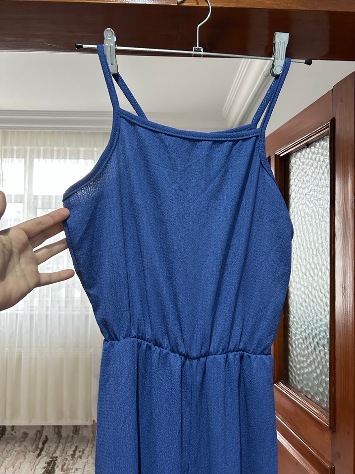 Mavi Drapeli İnce Askılı Kadın Tulum