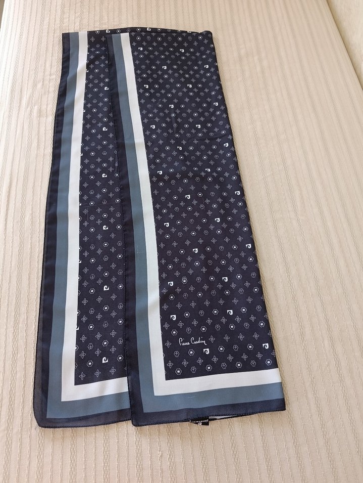 Koyu mavi renkte, sentetik kumaştan, drapeli ve desenli tasarıma sahip kadın fuları.