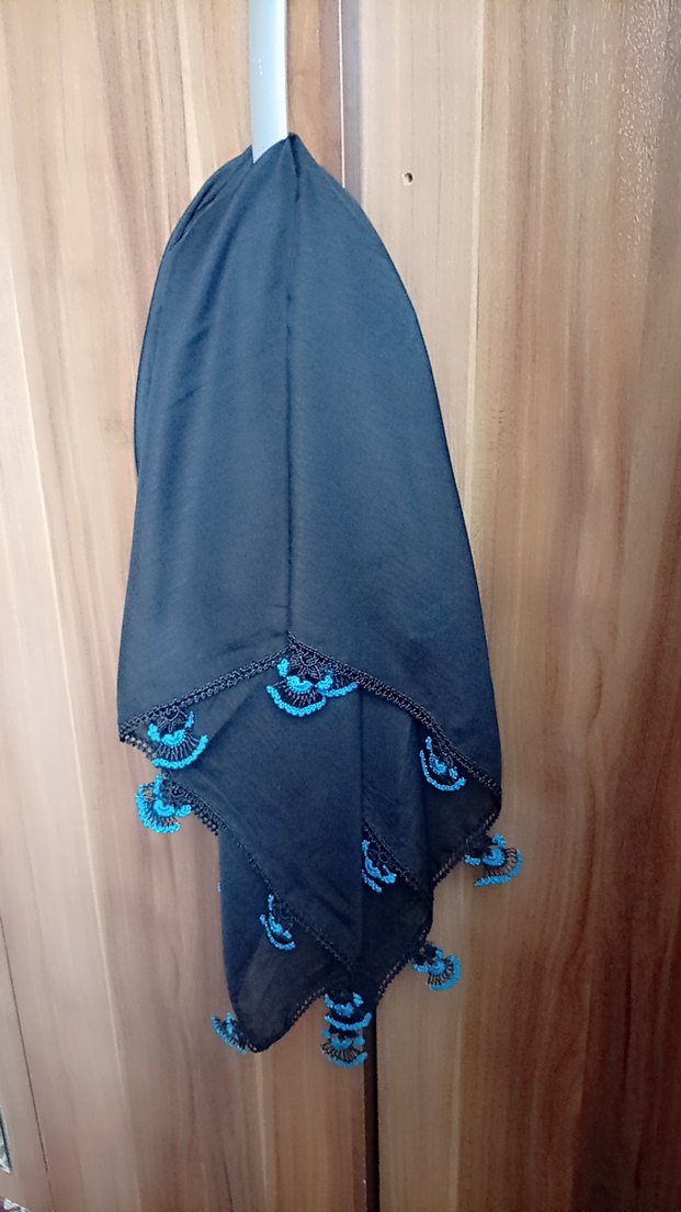 Kadınlar için koyu mavi renkte, drapeli tasarıma sahip şal. Kenarlarında mavi tığ işi detaylar bulunur ve sentetik kumaştan üretilmiştir.