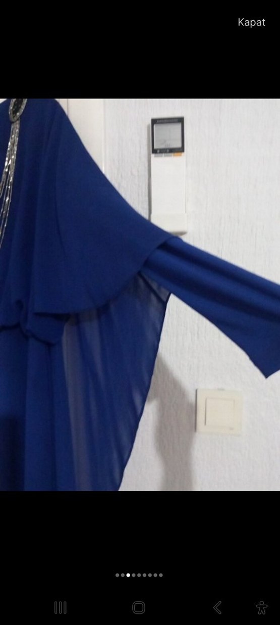 Parlak mavi renkte, drapeli ve kayık yaka detaylı kadın uzun elbise. Kolsuz ve bol kesimli, çağdaş ve avangart tarzda, parti için uygundur. Sentetik kumaştan üretilmiştir.