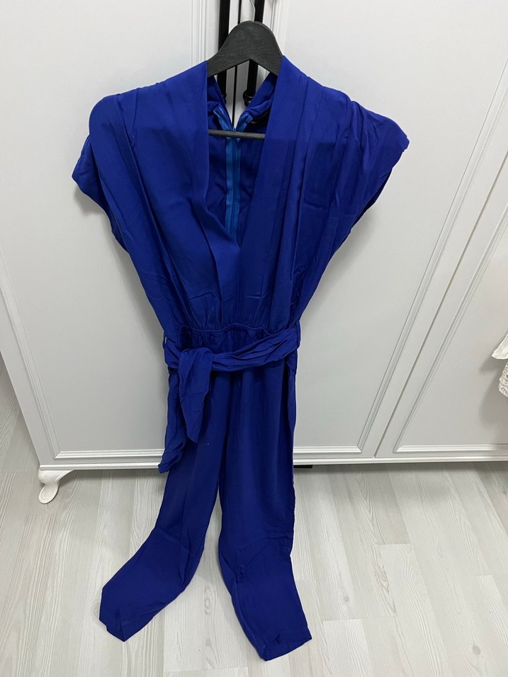 Koyu mavi, satenimsi kumaştan, v yaka ve drapeli tasarıma sahip, dar kesim ve kolsuz uzun tulum.